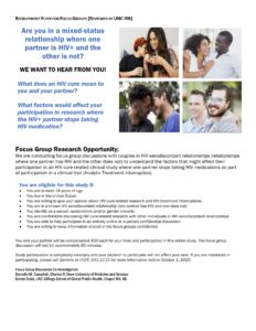 “We are conducting a study on perceptions of participation in HIV cure research among HIV serodiscordant couples and would appreciate it if you could share information with anyone who may be interested. We are seeking a wide representation of “couples” (not restricted to monogamous) who consider themselves to be racial/ethnic, and/or sex and gender minorities (gay/bi/SGL/men, black, latino, asian, women, trans/GNC queer individuals). Perceptions about HIV cure and HIV cure related research has not been captured among this group to date. Please see the informational flier below and attached. If you could assist with recruiting a few couples to a focus group and/or couples interview, I’d sincerely appreciate it. Compensation is provided.”